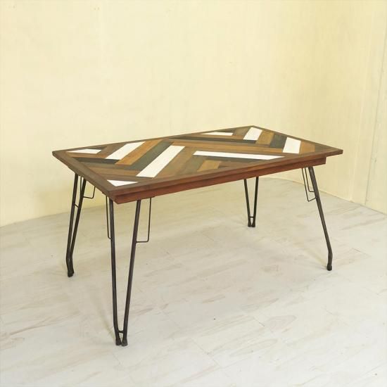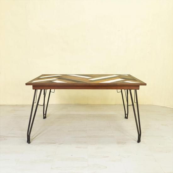 ヘリンボーン柄に組み込まれた天板が印象的なダイニングテーブルです。 少し広めの4人掛けテーブルとしてご利用いただける140cm×80センチの作りです。 アイアン脚に天板にはホワイトとブラックのペイントが組み合わされ、レイアウトのアクセントになります。