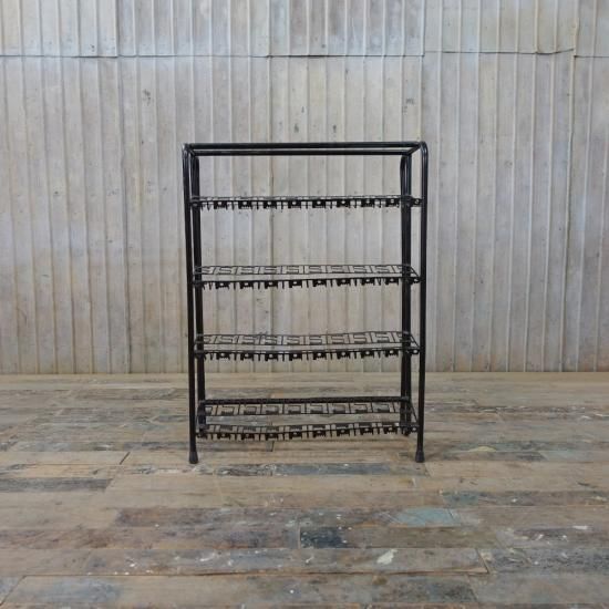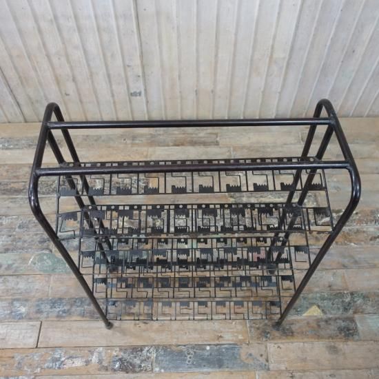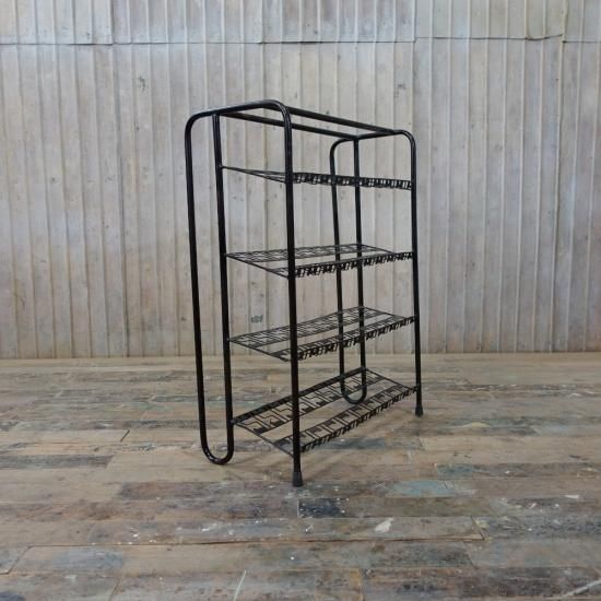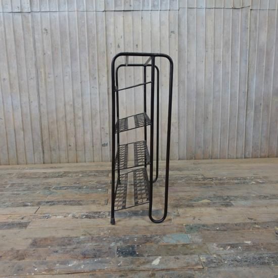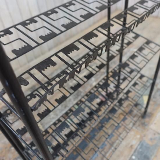 アンティークのアイアンラックです。 ブラックのカラーがっすっきりとした印象で、棚部分の飾りがアクセントになっています。 角度がついている棚板は、雑誌などをディスプレイしながらの収納におすすめです。