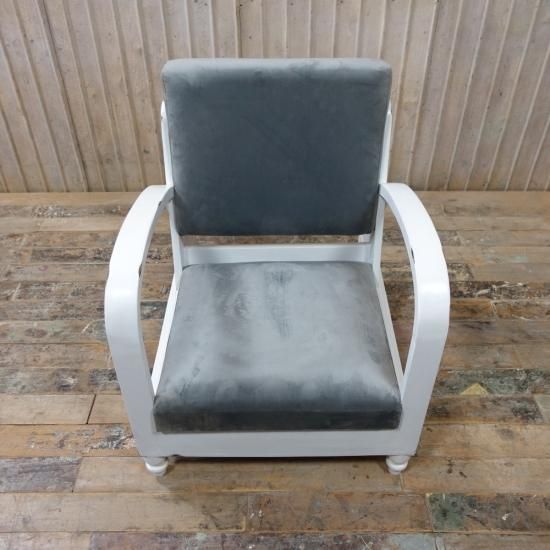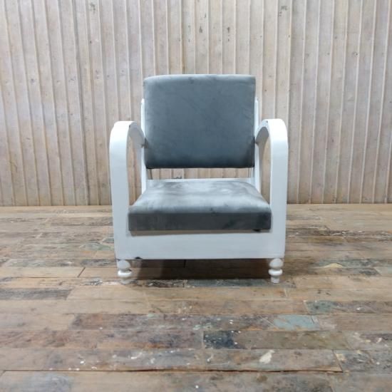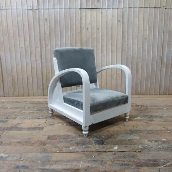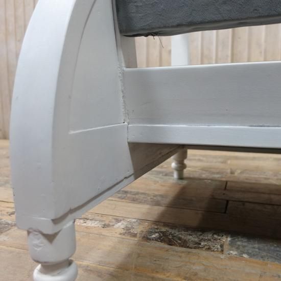 ホワイトペイントのアンティークチークのフレームに、グレーブルーのファブリックを組み合わせた一人掛けソファです。