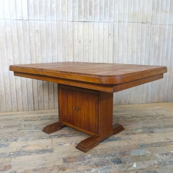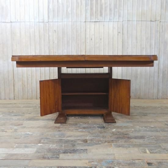 アンティーク家具を自社工場で日本向けにリメイクしたアイテムです。 珍しい収納付きのダイニングテーブルです。 天板はエクステンションタイプで、150cm〜180cmに伸びますので、 通常ですと4人掛けですが伸ばすと6人掛けに変化する作りです。 来客時などは椅子を追加するだけでよいので大変便利です。 。 さらに、天板下の足元には扉収納がございます。 棚板は取り外しも可能です。生活雑貨や消耗品の収納におすすめです。